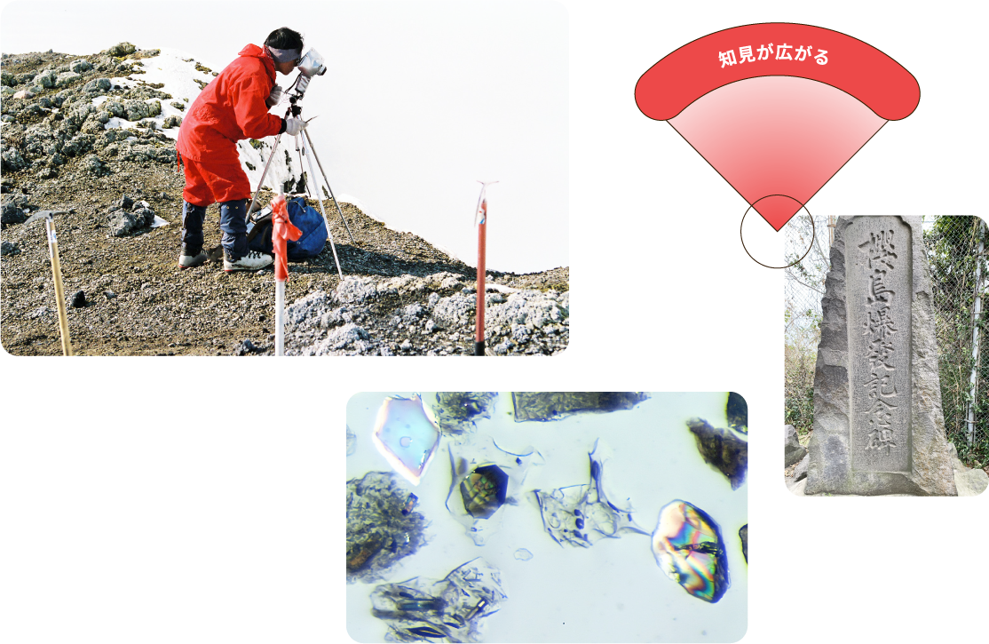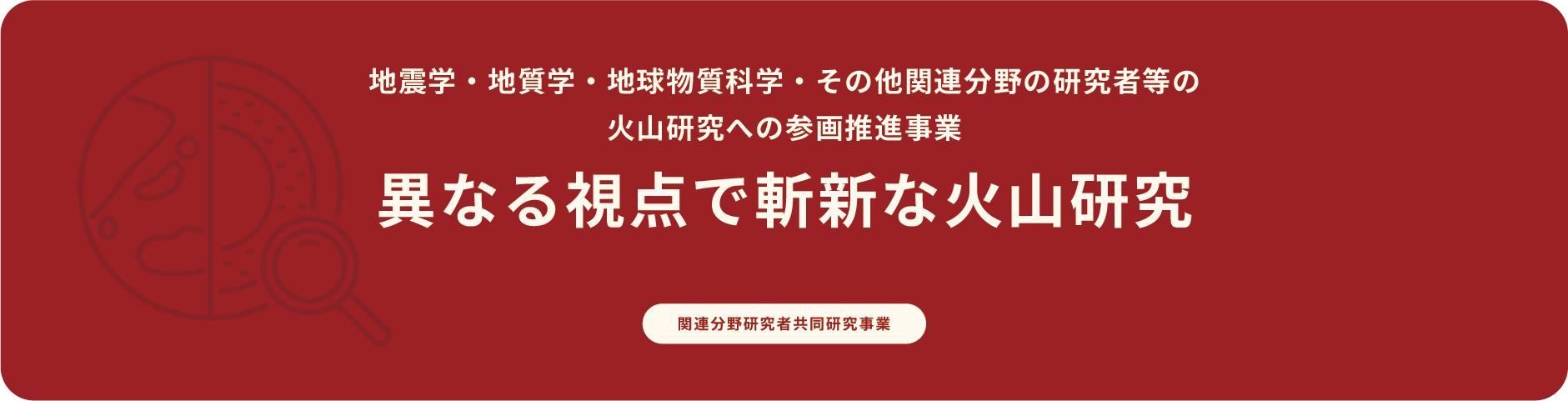 本事業では、火山研究を専門としていない地震学・地質学・地球物質科学・その他関連分野の研究者(以下、関連分野研究者)等の独自の発想や技術を生かし、 単独研究あるいは火山研究者との共同研究を促進します。本事業により行われる研究は公募とし、多様な分野から参画できるようにします。 また、 新たな研究分野の開拓 や 火山研究の深化 を進め、関連分野研究者と火山研究者の交流を深めるため、 成果報告シンポジウムを年1-2回開催します。シンポジウムでは、火山研究に関する基調講演などを含めることにより、 関連分野研究者の「火山学及び火山防災の知識力」や「火山研究の課題を解決する力」を養成します。
